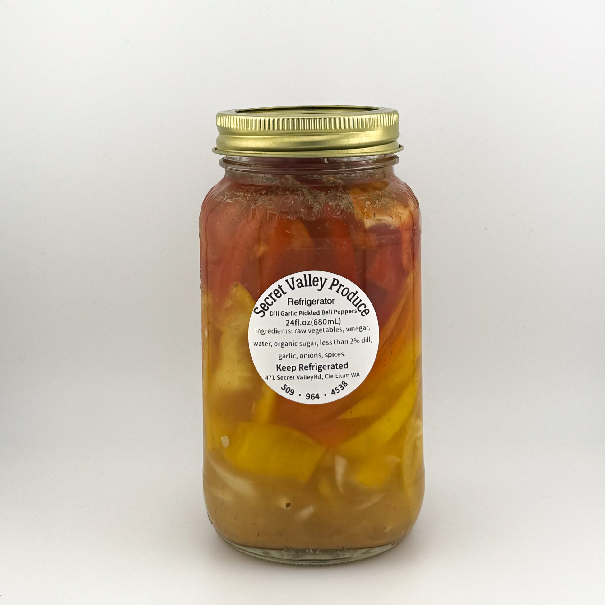 Hands down our favorite item! A surplus from a catering event led to this discovery. They are great on pizza, sandwiches, salads, and much more, also the brine is a great back for Tequila! Ingredients: Red, yellow, and Orange bell peppers, jalapeno, vinegar, salt, sugar, garlic, onion, and dill.